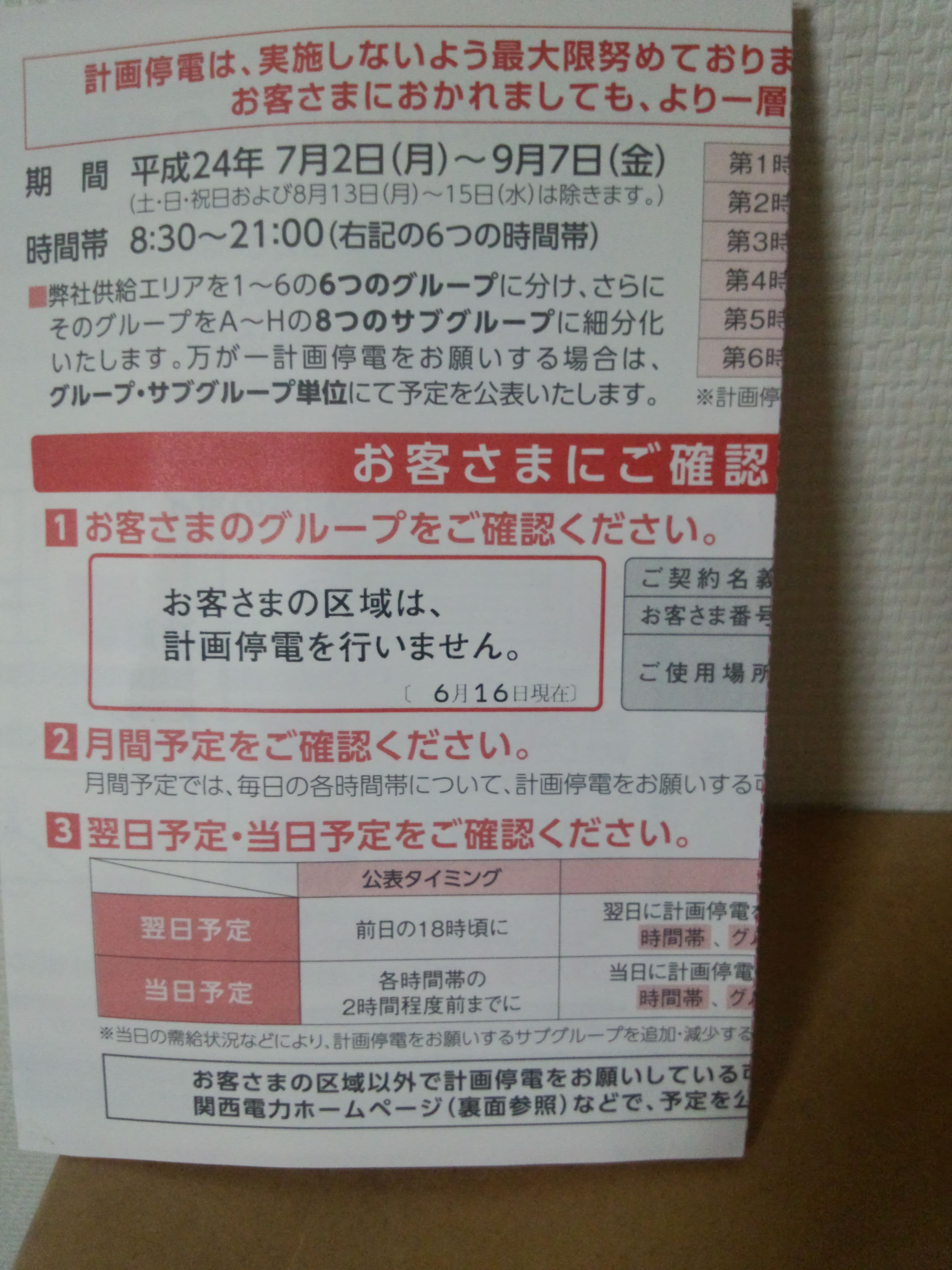 本日、当事務所の入居しているビルと私の自宅に、それぞれ関電から計画停電のお知らせの文書が来ました。
